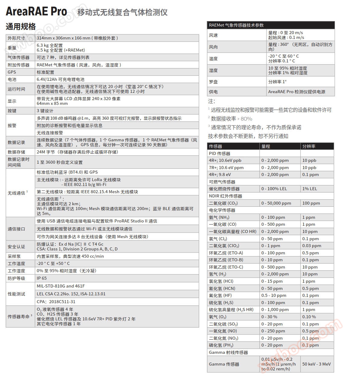 Безжичният композитен газов детектор AreaRAE Pro е подвижен зонен детектор с възможност за дистанционна комуникация, който едновременно открива множество газове, като токсични опасни газове, запалими газове, летливи органични съединения и излъчване, както и измерва метеорологични параметри, които влияят на скоростта и посоката на разпространението на газа.